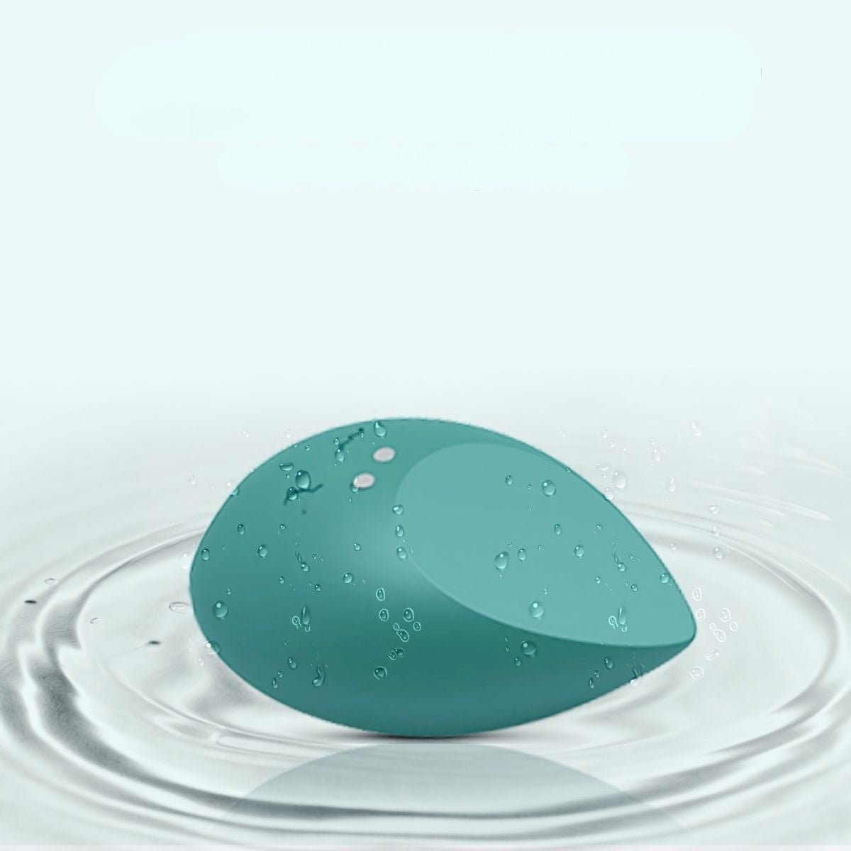 The Intimia Licking Tear-Drop Vibrator is a teal, leaf-shaped clitoral stimulator with two small round holes and subtle line engravings on the front. Its smooth surface and modern, minimalistic design resemble a simple face.