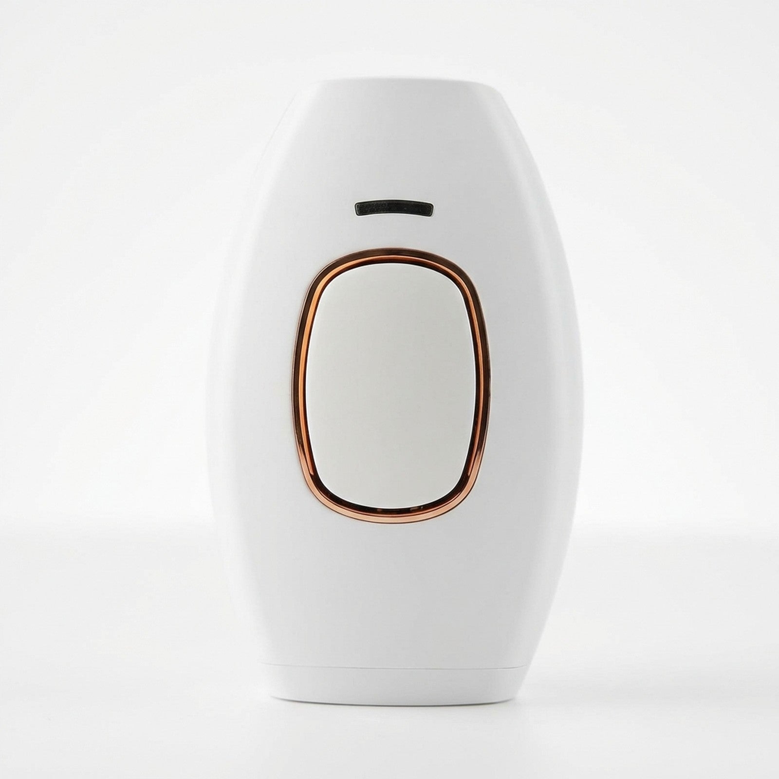 The UNIQ IPL Hair Removal Device in white, with a gold-bordered button, rests on a white countertop among glass decor—offering smooth, pain-free permanent hair reduction at home with 600,000 flashes.