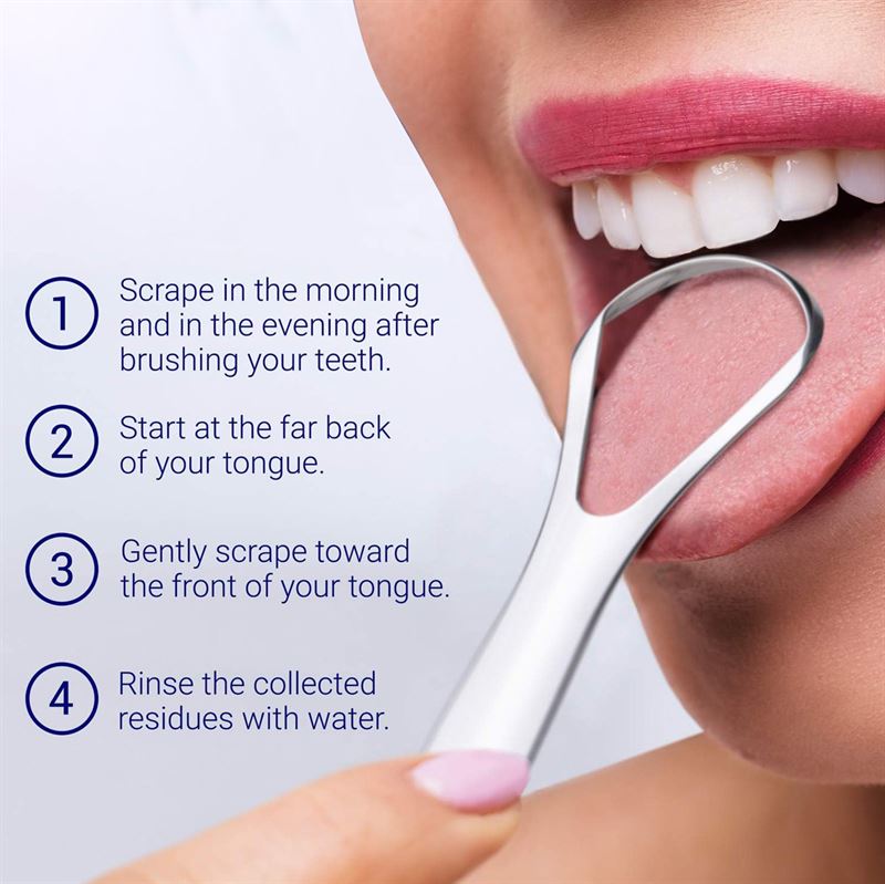 - Gently scrape your tongue from back to front to remove plaque.