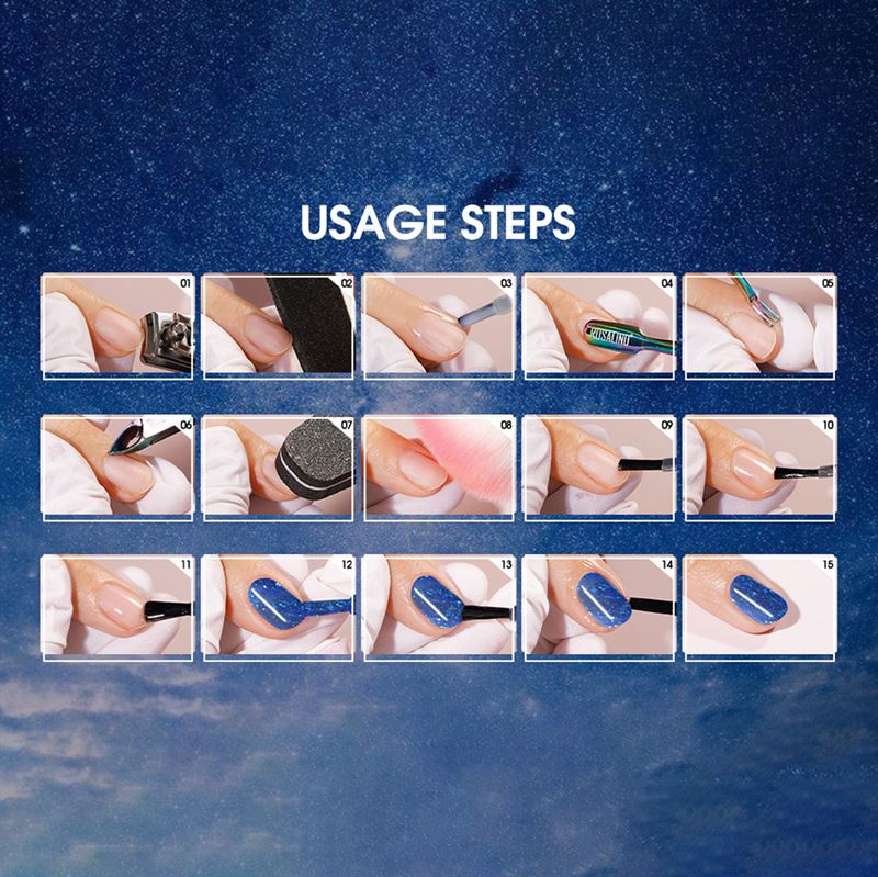 Application and use: Start by sanding the nail surface, then apply a base coat, choose your favourite colour from the pack and finish with a top coat. Remember to cure each coat under a UV/LED lamp for 60 to 120 seconds for optimal durability.