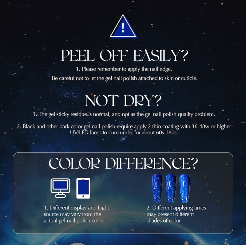 ATTENTION! Important notes: Avoid direct skin contact during use. If the product comes into contact with skin, rinse the area immediately. Darker colours may require longer curing time. Avoid placing the gel nail polishes in direct light.